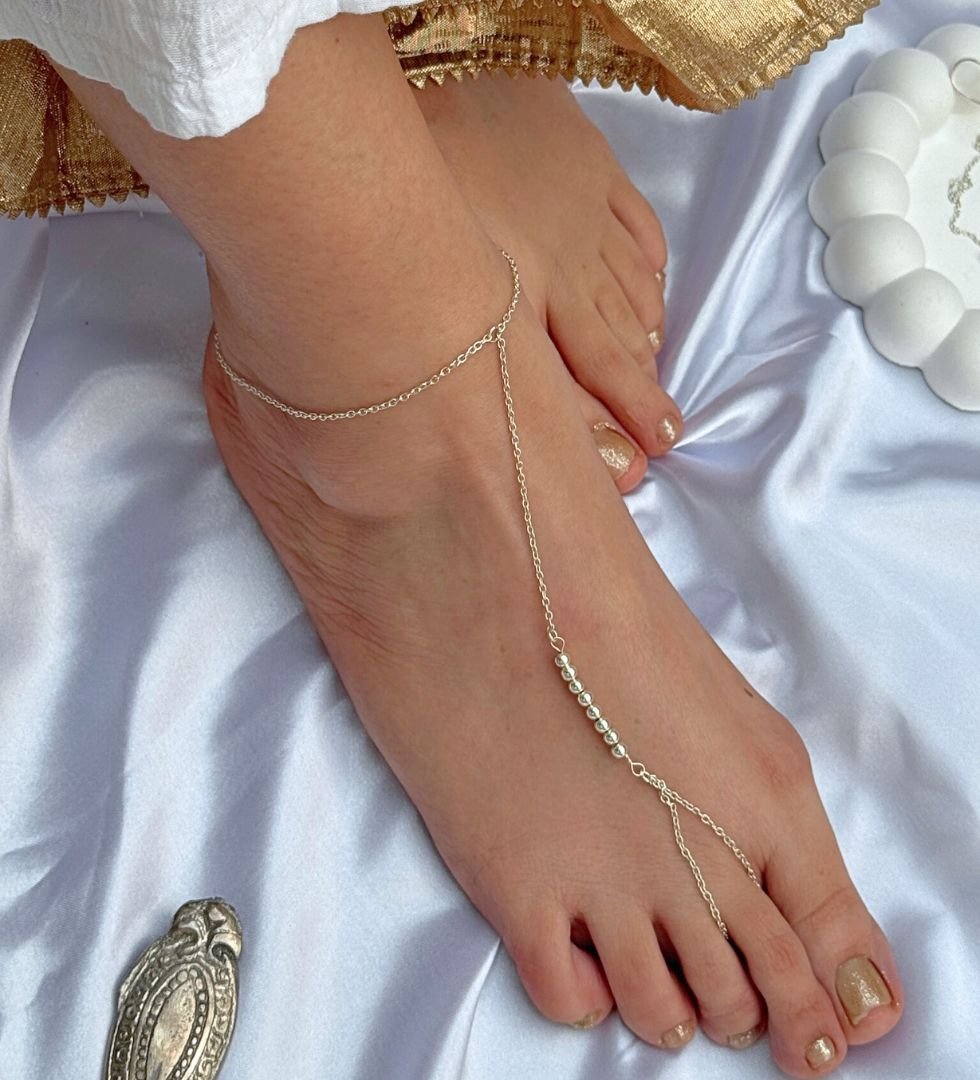 The Celestial Gait Anklet Feet Chain is a graceful blend of simplicity and shine, crafted to add a soft celestial shimmer to every step. Designed with delicate silver beads that catch the light effortlessly, this lightweight anklet offers a refined elegance suitable for daily wear or special occasions. Its minimal structure ensures comfort while maintaining a luxurious presence, making it the perfect accent for barefoot styling, festive looks, vacations, and contemporary everyday fashion.