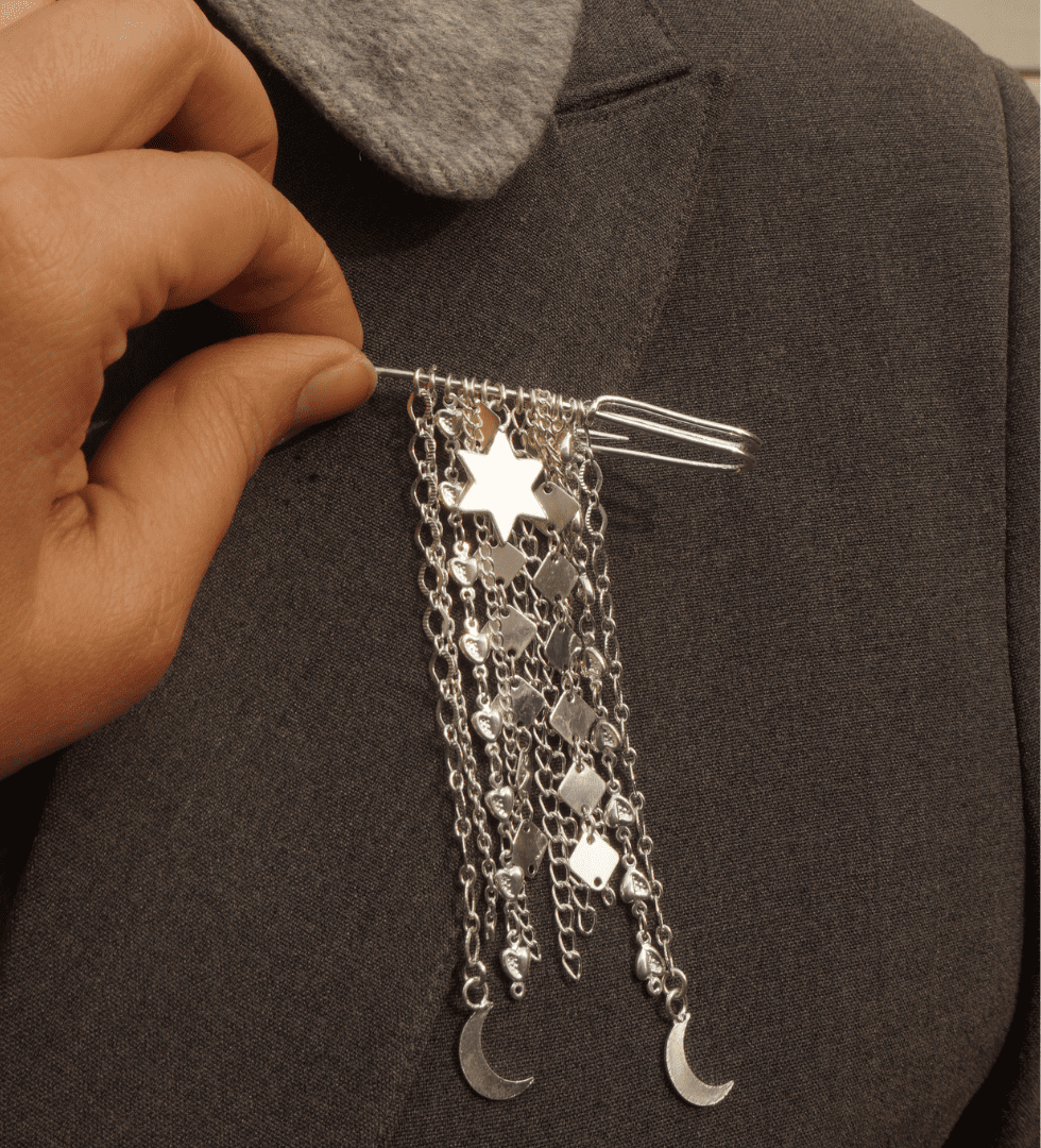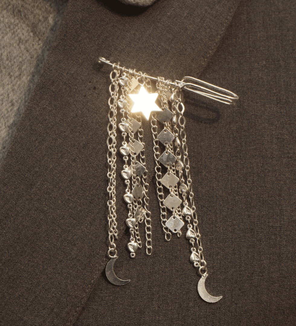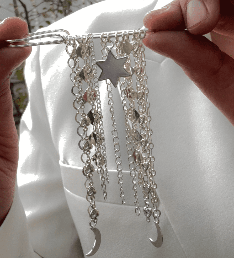The Chandra Sutra Weave Pin is a handcrafted silver masterpiece inspired by lunar rhythms and traditional weaving artistry. Featuring delicate mesh-like strands, reflective geometric discs, and crescent moon charms, this pin creates soft movement and a serene metallic shimmer with every step. Its lightweight woven structure paired with a solid handcrafted safety-pin base makes it a contemporary yet poetic accessory for layering over knits, coats, sarees and scarves. Each piece is individually handmade, retaining small artisanal imperfections that celebrate its craft origin.