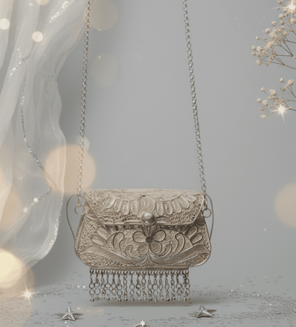 Material: Handcrafted in 92.5 sterling silver with traditional filigree artistry. Craftsmanship: Features delicate, lace-like wirework forming intricate floral and scroll motifs. Design Detail: Embellished with a dome clasp, fringe detailing, and a detachable silver chain handle. Finish: Naturally polished sheen that glows with timeless grace.