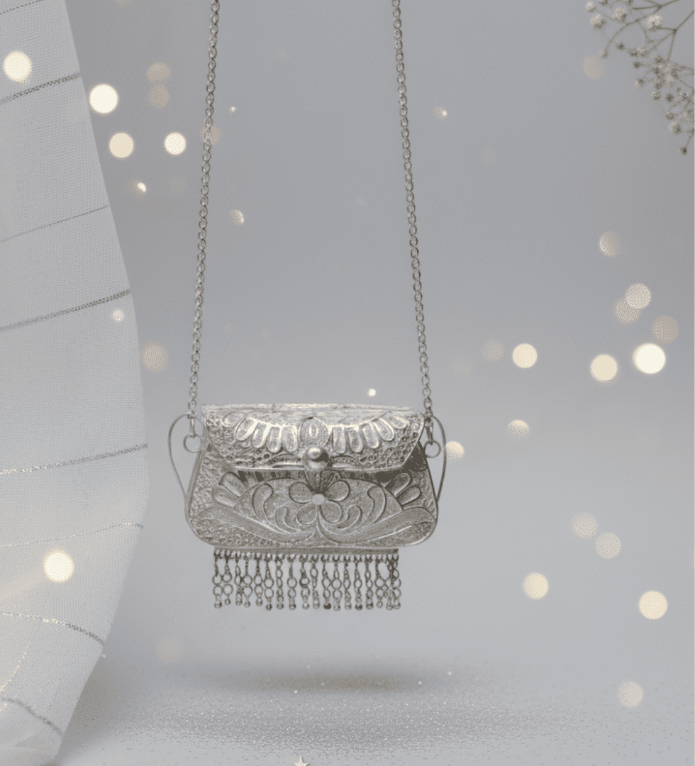 The Chandrika purse draws from India’s ancient filigree silverwork tradition, practiced by master artisans of Odisha and Andhra Pradesh. Each swirl and coil of silver wire is hand-twisted, shaped, and soldered, transforming metal into poetry.