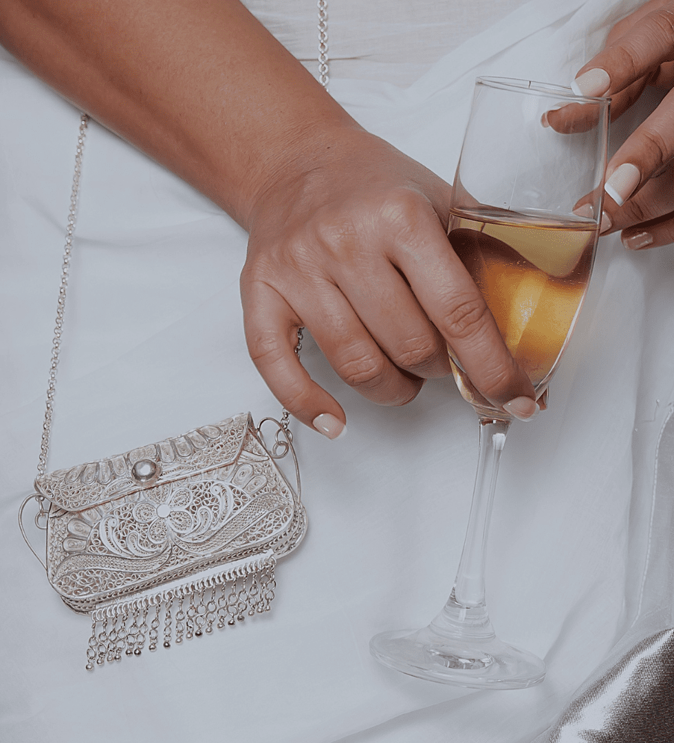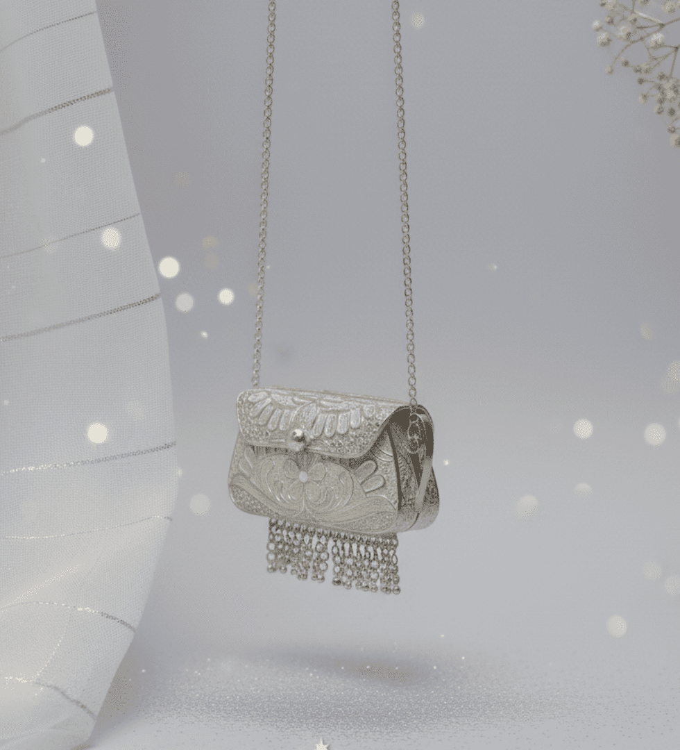 Material: Handcrafted in pure silver (92.5 sterling silver). Craftsmanship: Features intricate filigree work, a centuries-old craft of twisting fine silver wires into delicate motifs. Design Detail: Adorned with a floral pattern and fringe detailing, symbolizing timeless femininity and ornate grace. Closure & Chain: Secured with a handcrafted clasp and complemented by a silver chain handle for versatility and ease.