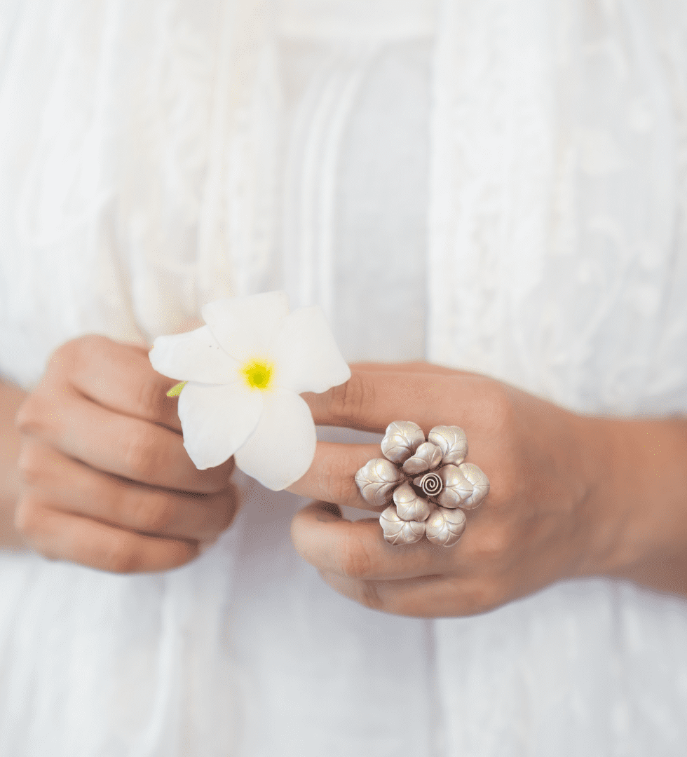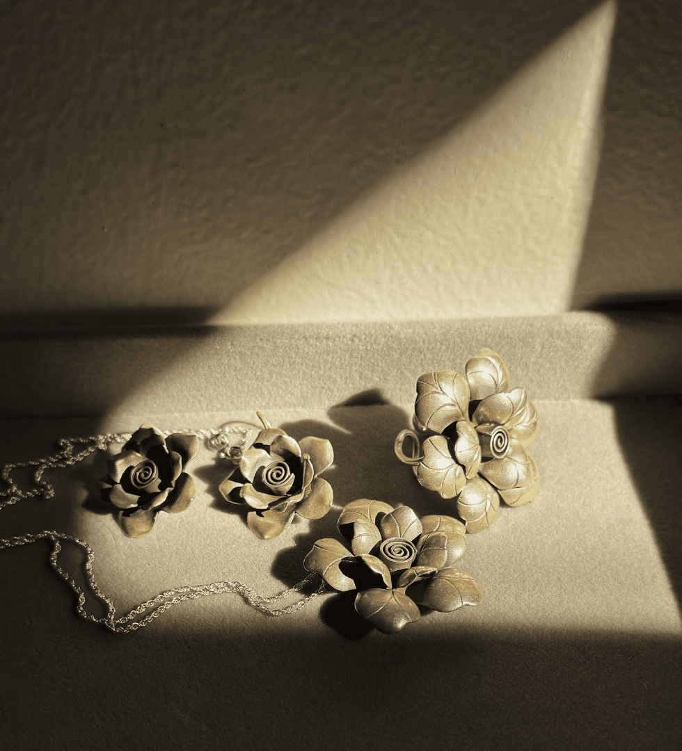 Floral Thread Silver Set brings together sculptural florals and fine silver links in a harmonious composition that feels both heirloom-inspired and quietly contemporary. Crafted in sterling silver 92.5, this thoughtfully curated set includes a statement floral ring, delicate chain, versatile pendant-brooch, and floral drop earrings. Each piece carries hand-finished textures and organic petal forms, making the set ideal for those who appreciate slow craftsmanship and timeless design.