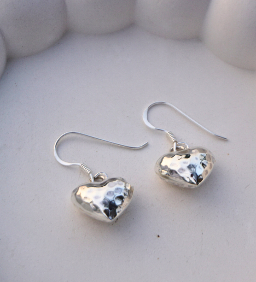 Hand-formed in 925 sterling silver, the Hammered Solace Heart Earrings celebrate the quiet beauty of imperfection. Each heart carries a gently hammered texture, reflecting light in soft, uneven rhythms—much like the moments that shape us. Minimal yet expressive, this pair is designed to feel intimate, timeless, and deeply personal.