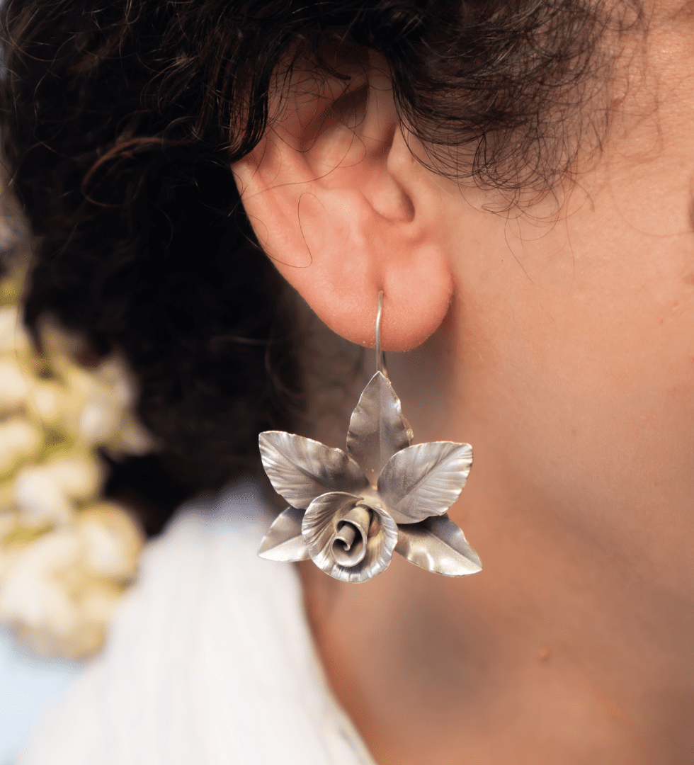 The Luna Flora Silver Earrings capture the serene glow of moonlight entwined with the delicate beauty of blooming flora. Handcrafted in 92.5 sterling silver, these earrings combine celestial inspiration with botanical grace. Their sculpted petal forms and soft polished finish evoke a quiet elegance, making them a timeless statement of refinement. Designed with The Parah Studio’s signature balance of tradition and modern artistry, the Luna Flora Earrings reflect the harmony of nature, light, and craftsmanship.