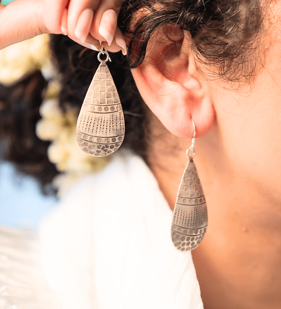 The Nomad Drops Silver Earrings embody the spirit of wanderers, free, grounded, and eternally curious. Handcrafted in 92.5 sterling silver, these earrings feature fluid, organic contours inspired by the landscapes and textures encountered on a timeless journey. Their polished finish and sculptural balance create a refined yet earthy elegance. Reflecting The Parah Studio’s design language, the Nomad Drops unite craftsmanship and soul, offering a piece that feels both rooted in tradition and modern in expression.