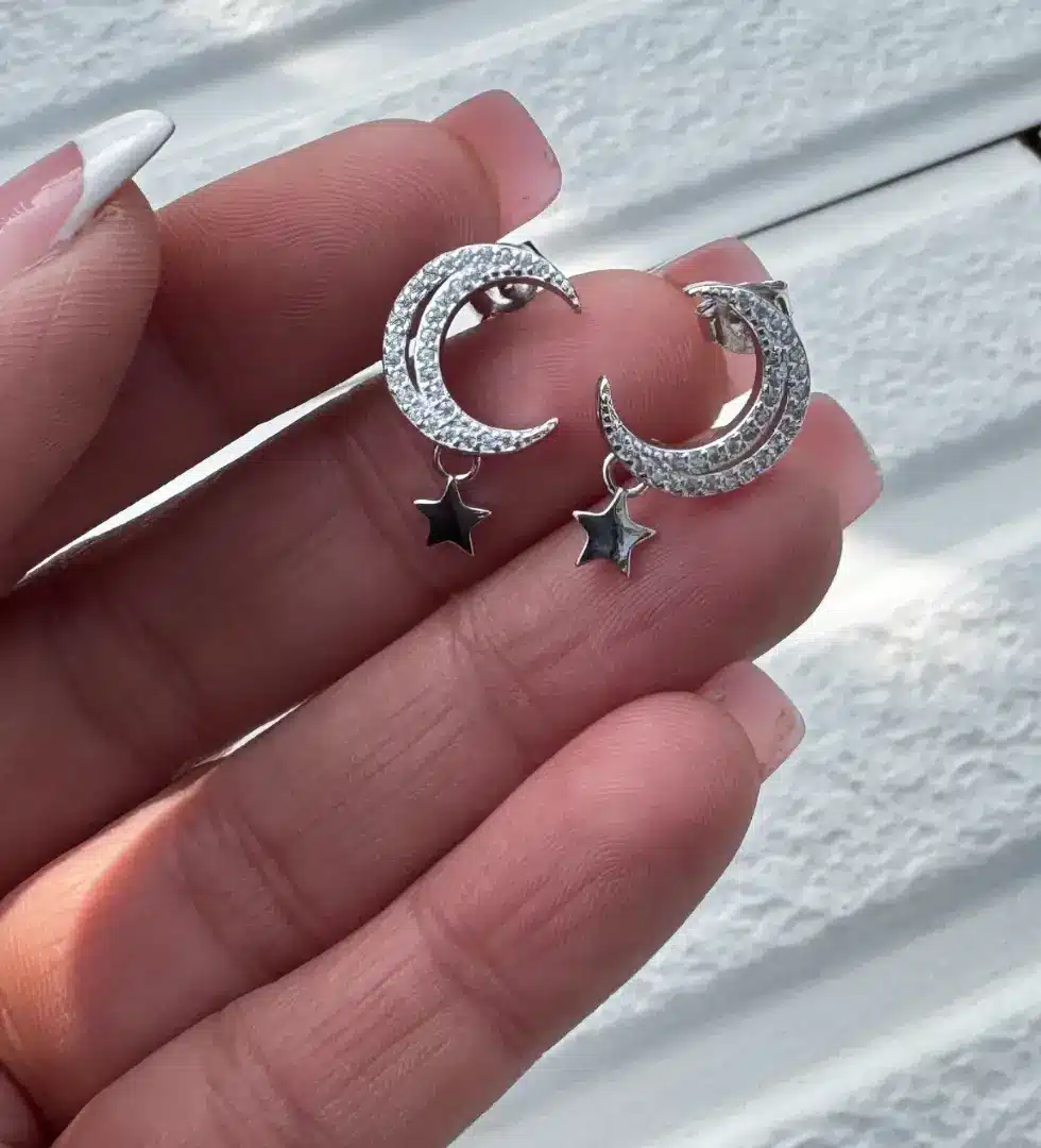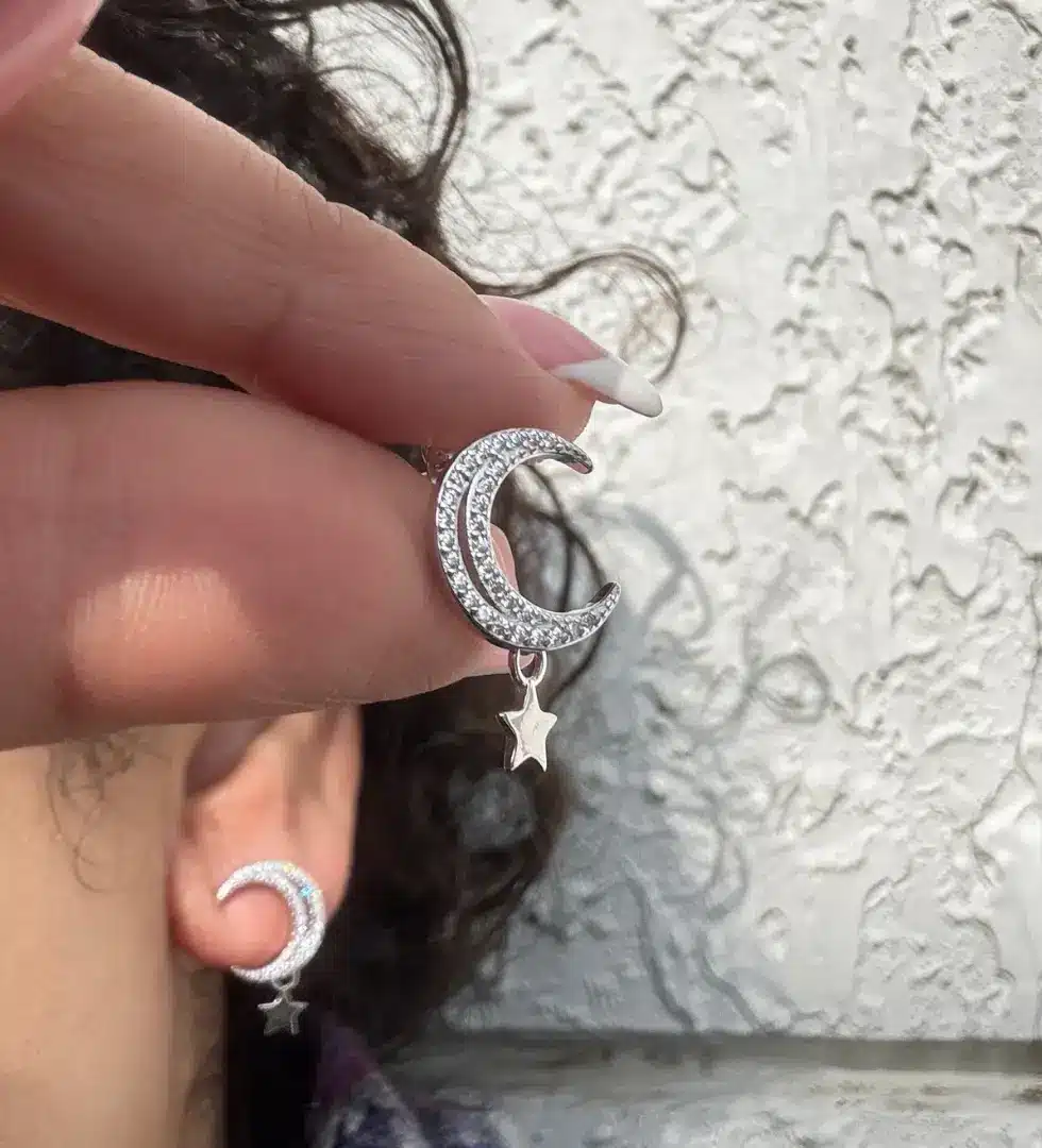 - Crescent moon design with a delicate dangling star