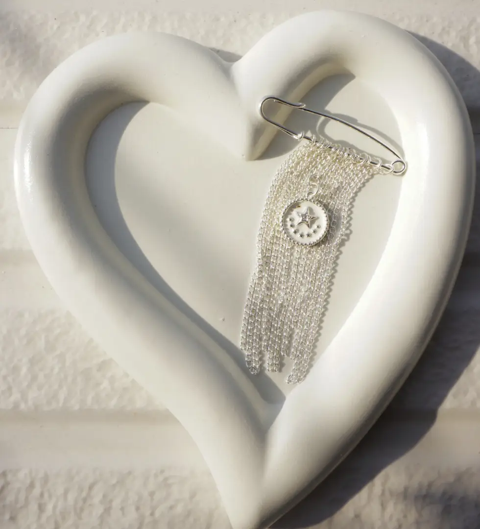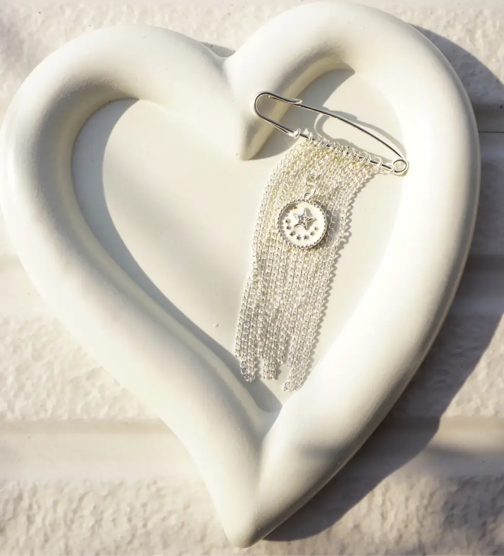 The Orbit Star Silver Brooch is a refined celestial accent inspired by the quiet movement of stars in orbit. Crafted in sterling silver, the design features a delicately detailed star medallion suspended against a soft cascade of fine silver chains. The fluid drape creates gentle motion, adding depth and elegance to the piece. Finished with a contemporary safety-pin structure, this brooch blends symbolism with modern wearability, making it a timeless addition to the PARAH STUDIO universe of poetic, handcrafted jewellery.