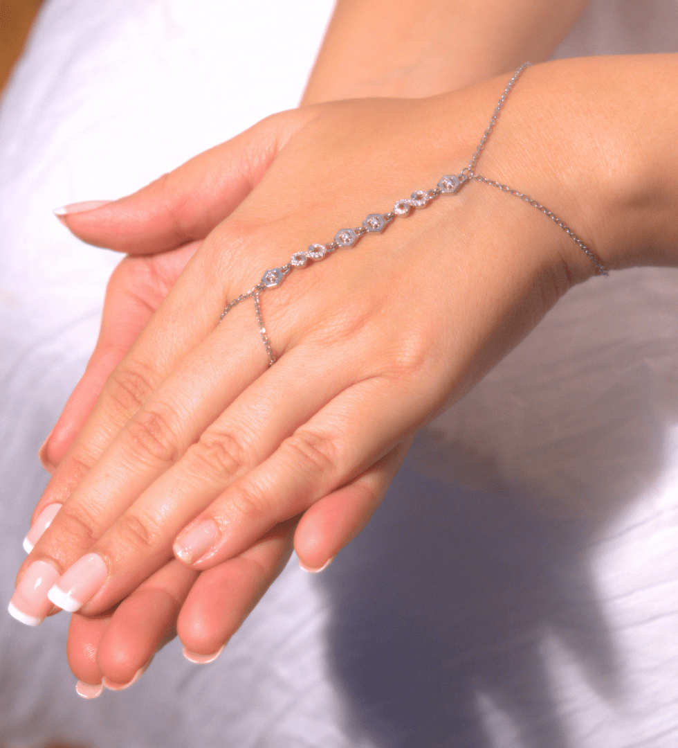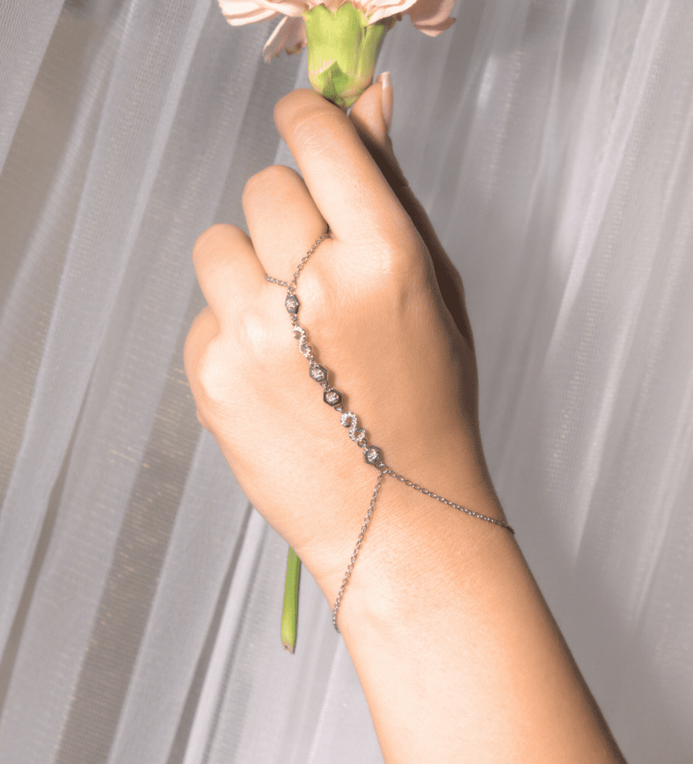 Material: 92.5 sterling silver with handcrafted filigree petals. Design Detail: Floral motif inspired by gardens, connecting wrist to finger with an intricate silver chain. Craftsmanship: Handmade by skilled artisans using age-old tarakashi (filigree) technique. Feel: Lightweight, fluid, and delicately feminine. Occasion: Perfect for festive occasions, mehendi, or heirloom dressing.