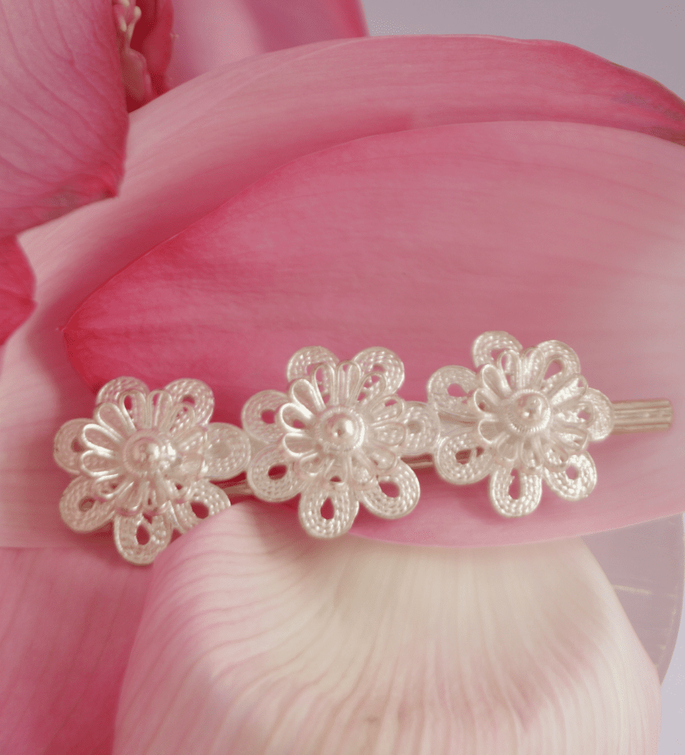 The Silver Floral Charm Hair Pin captures the delicate poetry of blooming petals in a timeless sterling silver form. Handcrafted with care in 92.5 silver, it reflects the beauty of nature through intricate floral detailing and a luminous finish. Designed to rest gracefully in your hair, this piece embodies a perfect blend of tradition and modernity, subtle yet striking, elegant yet effortless. A true expression of The Parah Studio’s refined craftsmanship, it adds a touch of silver charm to every look.