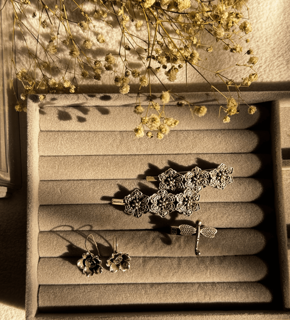 The Silver Garden Heirloom Set is a quiet ode to nature preserved in time. Featuring sculpted florals, winged detailing, and artisanal silverwork, this trio captures the poetry of a garden in still bloom. Designed to feel collected, cherished, and passed down, each piece speaks of softness, strength, and handcrafted elegance.