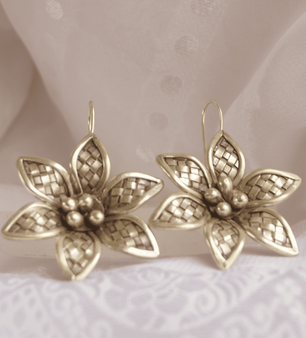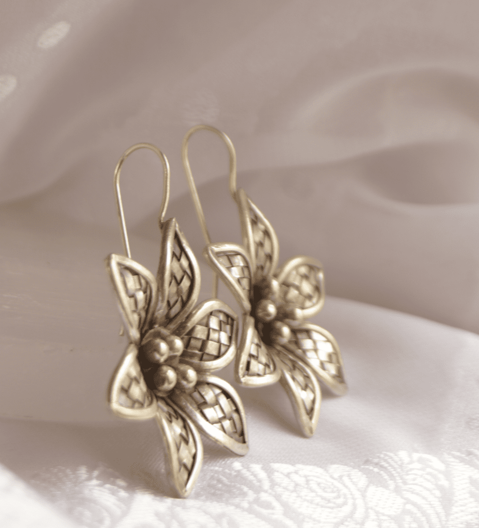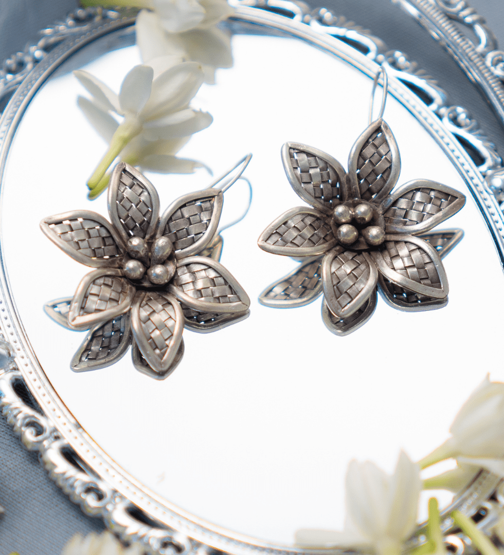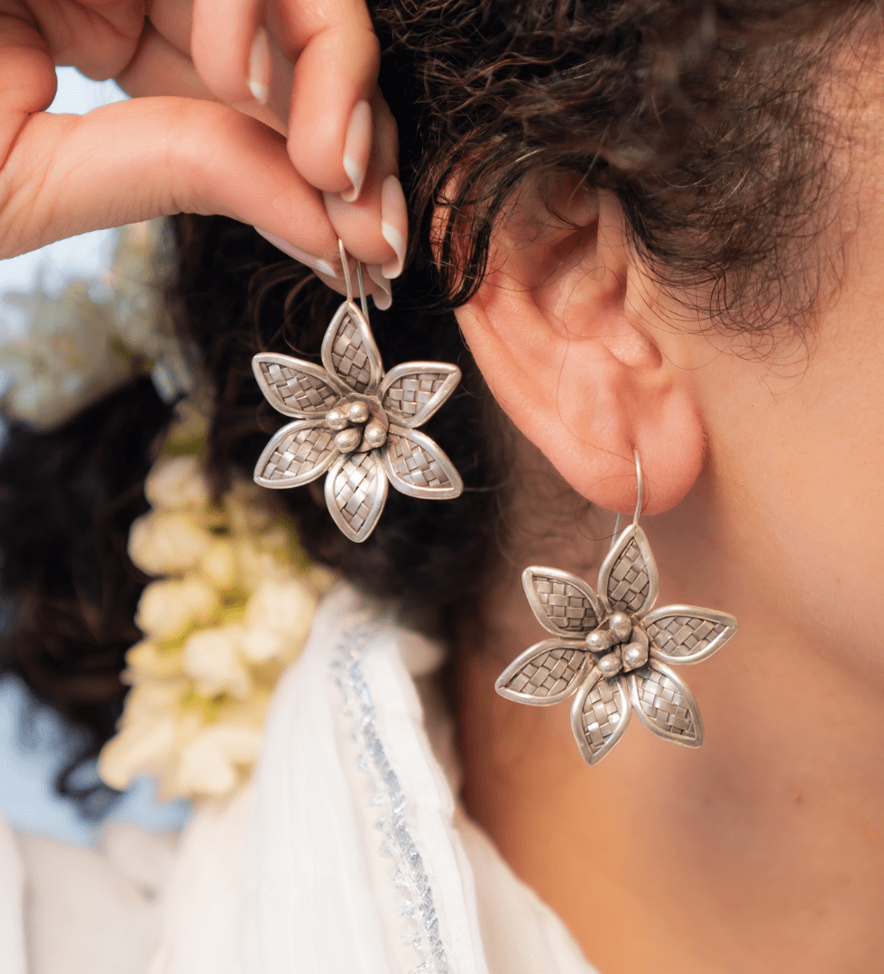 The Starwoven Flower Silver Earrings capture the poetry of starlight woven into floral form. Crafted in 92.5 sterling silver, they blend celestial geometry with organic grace, creating a design that feels both ethereal and timeless. Each petal glimmers with subtle texture, mirroring the quiet brilliance of night skies and blooming nature. Thoughtfully handcrafted, the Starwoven Flower Earrings embody The Parah Studio’s essence-artistry rooted in tradition, reimagined with modern elegance.