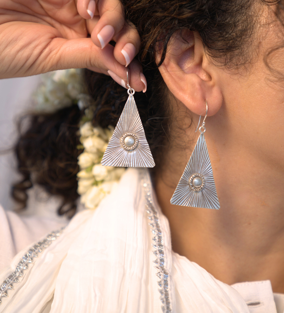 The Tattva Contours Silver Earrings are a poetic expression of form and flow — inspired by the elemental essence of nature and human craftsmanship. Sculpted in fine 92.5 sterling silver, the design traces fluid contours that mirror organic movement and quiet balance. Every curve reflects light in subtle gradients, creating an aura of understated allure. A timeless piece that embodies Tattva — the pure principle of being — where simplicity meets soulful artistry.