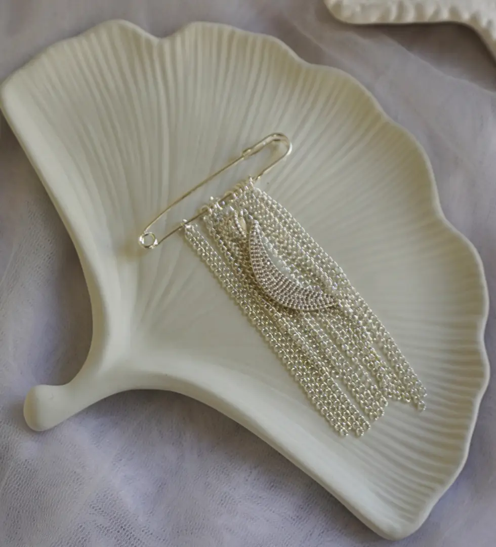 Veil of the Moon Brooch is a statement expression of quiet luminosity, handcrafted in 92.5 sterling silver. Inspired by the soft drape of moonlight, this brooch features a crescent form layered with cascading silver chains that move fluidly with every step. The safety-pin silhouette adds a contemporary edge while allowing versatile styling across Indian and modern wardrobes. Rich in detail yet refined in form, this piece embodies THE PARAH STUDIO’s signature balance of poetry, craftsmanship, and timeless design. Designed to be worn as an accent or a focal piece, it reflects elegance that lingers, like moonlight itself.