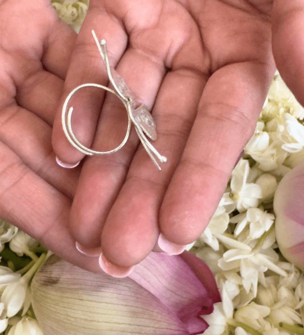 The Winglet Loop Ring embodies movement and grace in solid form, a sculpted piece of 92.5 sterling silver that flows like a gentle curve of wind. Designed with fluid contours that catch the light effortlessly, it mirrors the soft strength of nature’s wings in motion. Handcrafted by artisans, this ring blends modern sculptural aesthetics with timeless elegance, making it a signature piece that celebrates fluidity, freedom, and individuality.